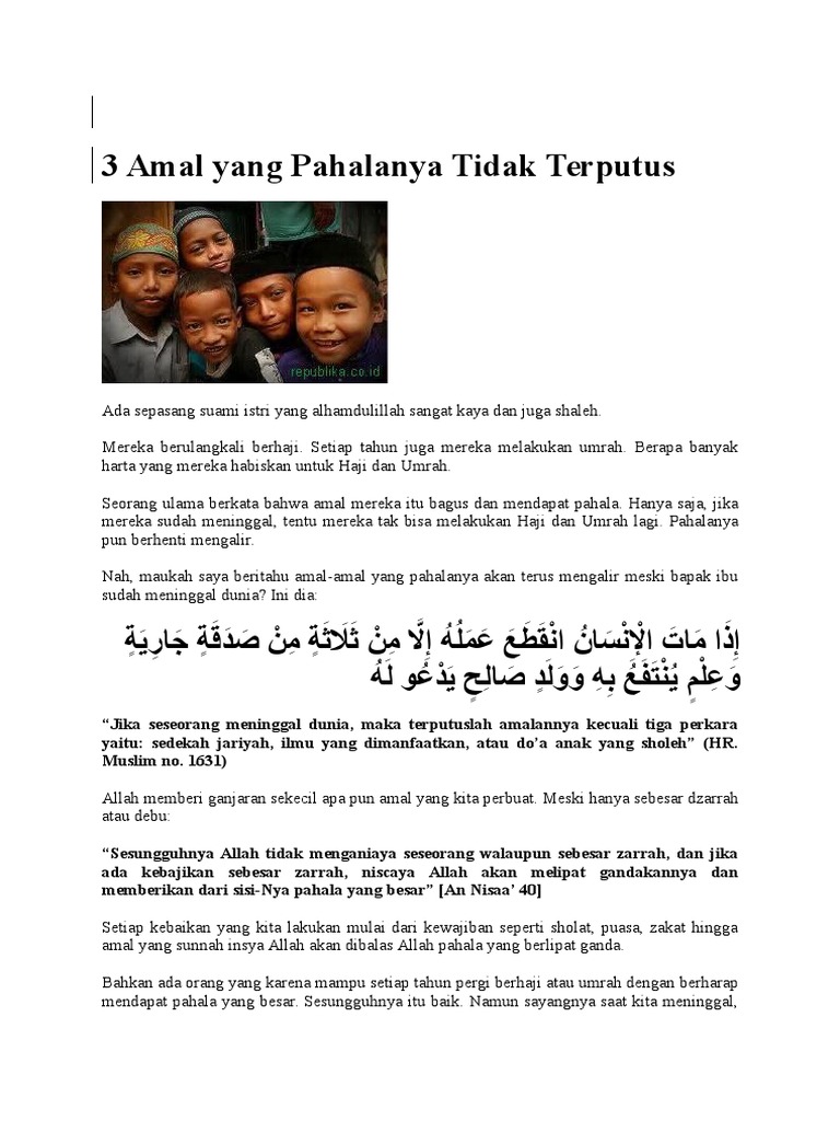 Menurutnya berbeda dengan sedekah makanan dan minuman sekali dimanfaatkan menjadi habis. Yg terakhir jwbnya satunya lupa. 3 amalan yang tidak akan pernah putus sampai kita meninggal berdasarkan hadits diatas yaitu: Amal jariyah doa anak sholeh satunya lupa. Read hadits tentang amalan yang paling utama from the story kumpulan hadits anak muslim by mazyanmazred (rediyanto) with nabi shallallahu alaihi wasallam mengabarkan bahwa amal perbuatan yang paling utama adalah ketiga amalan ini yang berurutan keutamaannya.